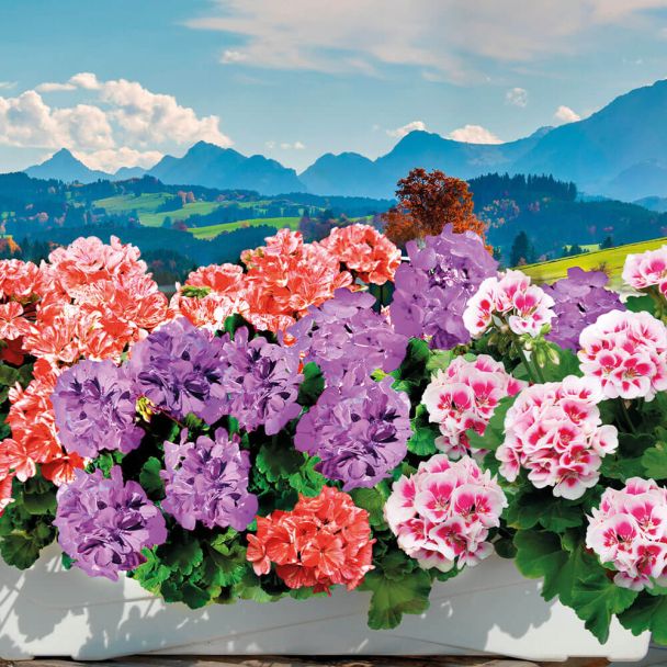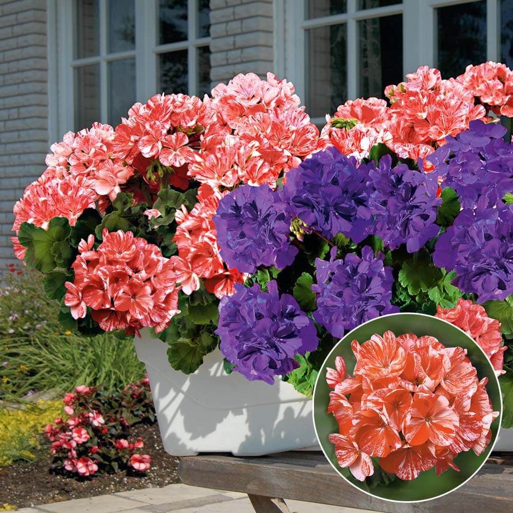 Počet kusů v balení:3 ks Vzpřímený muškát. Poloplné lososově oranžové květy s bílým žíháním. Svěží tmavě zelené listy. Bohatě kvete od pozdního jara do prvních mrazů.