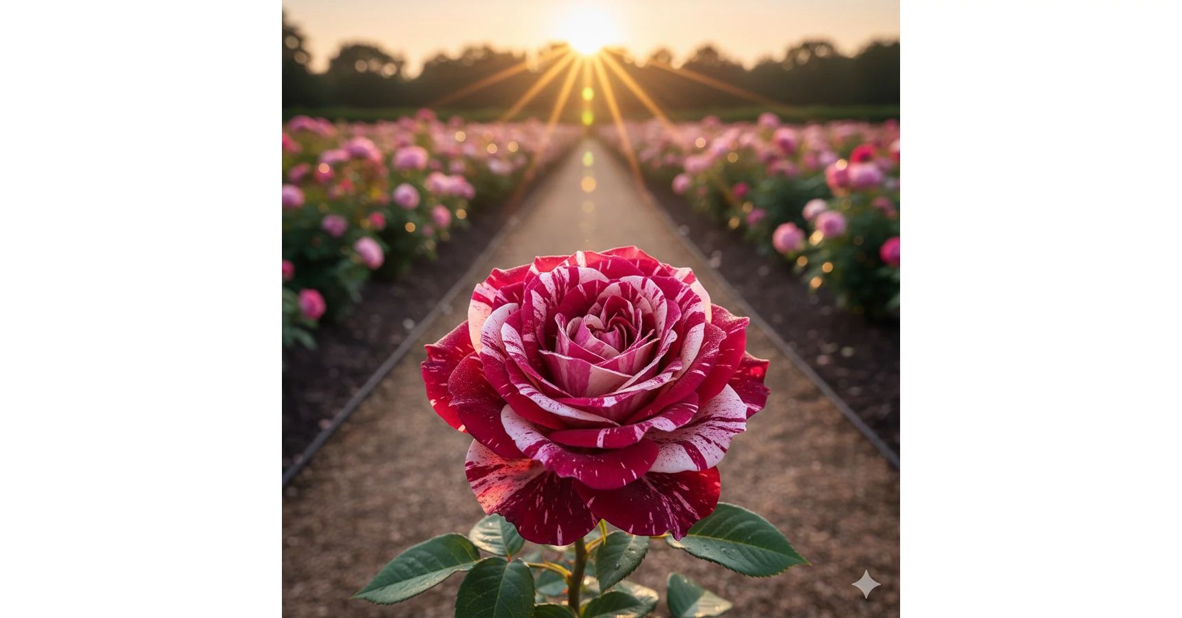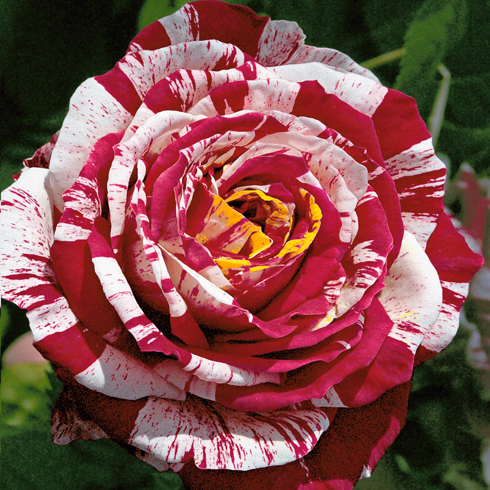 Čajová růže. Růžovočervené květy s bílým žíháním nebo znaky. Kvete od pozdního jara do podzimu. Sytě zelené lesklé listy. Zdravý, silný růst.