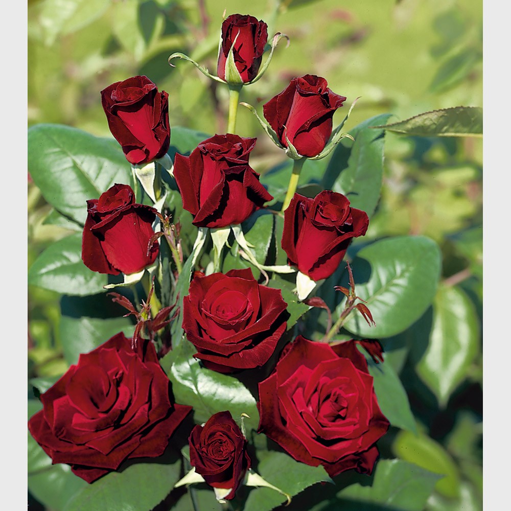 Květen – říjen, poupata černé jako noc, rozkvetlá růže je sametově/tmavě červená, voňavá