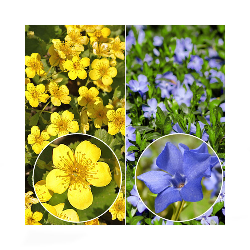 Počet kusů v balení:12 ks •Mochnička trojčetná• (6 sazenic) Nízká trvalka vhodná do polostínu nebo stínu, nejlépe se jí daří ve vlhčí zemině. Vytváří souvislé porosty. Je vhodná do skalek, zídek nebo na obruby záhonů. Dorůstá do výšky 10 cm, kvete od dubna do května žlutými květy. •Barvínek menší• (6 sazenic) Stálezelená, půdokryvná trvalka s půvabnými, světle fialovými květy, které mají tvar větrníku. Kvete od dubna do července, po zbytek roku rostlinu zdobí sytě zelené, lesklé listy. Nenáročná rostlina.
