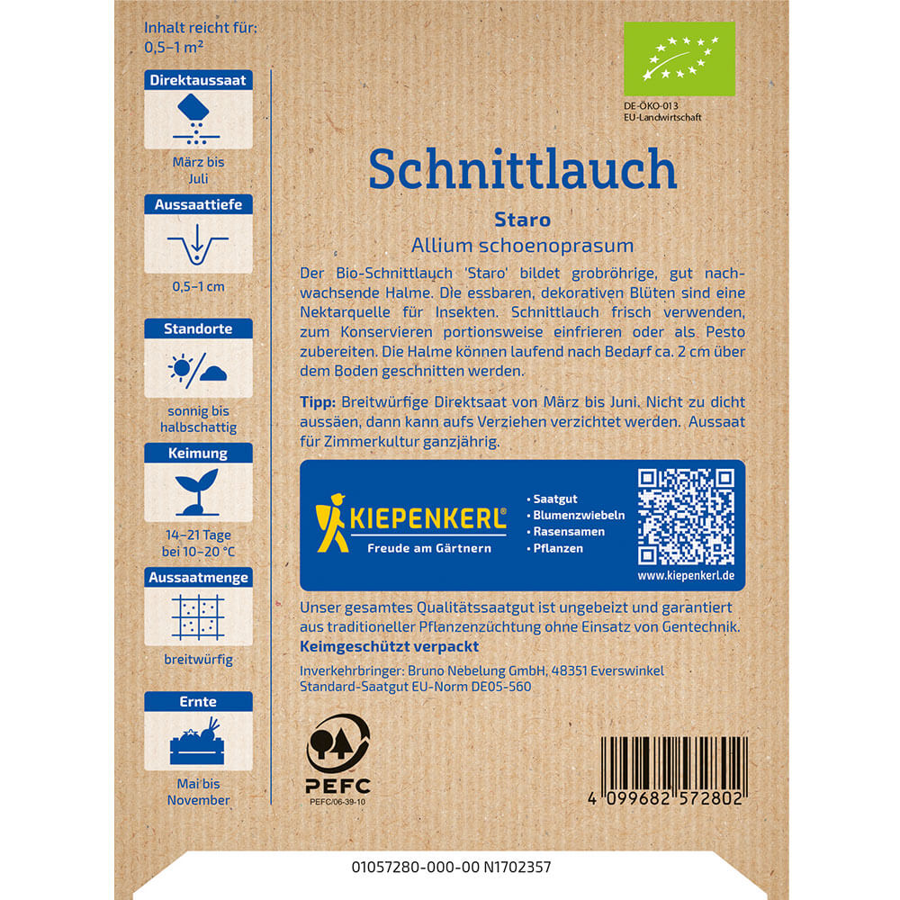 Počet kusů v balení:1 ks Pažitka patří mezi trvalky, má pěkné jedlé květy a hodí se rovněž do okrasných a jedlých trvalkových výsadeb. 'Staro' je vitální, výnosná odrůda pažitky vhodná pro rychlení v nádobách i pěstování na záhoně. Listy jsou tmavě zelené, dlouhé a pevné. Tato odrůda s velmi bujným růstem dobře přezimuje. Srovnávací studie ukazují, že odrůda Staro má výrazně širší / silnější listy než jiné odrůdy. Kromě využití za syrova je velmi vhodná k mražení nebo sušení. Obsah balení vystačí na prostor 0,5 - 1 m². Bio osivo.