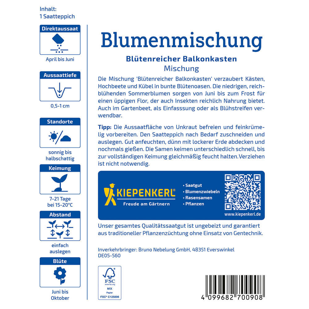 Počet kusů v balení:1 ks Směs jednoletých rostlin určená pro balkonové truhlíky, vyvýšené záhony nebo k obrubě záhonů. Rostliny dorůstají do výšky 20–40 cm. Poskytnou Vám pohled na pestrobarevné květy, které přitahují hmyz. Výsevní pás 15x150cm.