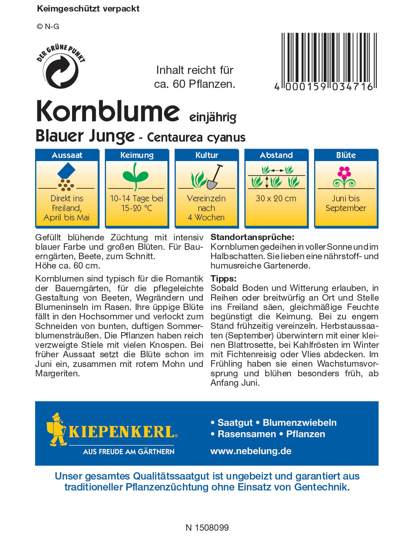 Počet kusů v balení:1 ks Chrpa modrá je nenáročná letnička, která často roste v obilných polích nebo při krajích silnic. Dorůstá do výšky 30–80 cm a kvete od června do srpna modrými květy. Dříve se používala jako bylina pro své močopudné účinky. Balení obsahuje cca 60 semen.