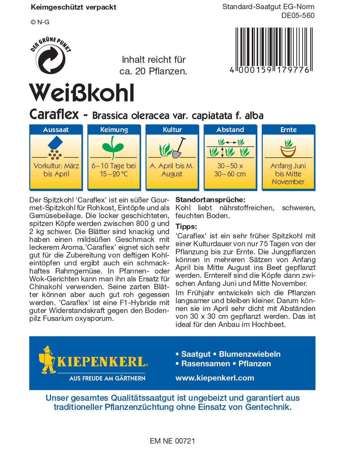 Počet kusů v balení:1 ks Rané lahůdkové zelí s křupavými listy. Jemná a sladká chuť. Vhodné pro konzumaci za syrova i k tepelné úpravě. Světle zelené hlávky se zužují do špičky a váží 1 - 2 kg. Pro jarní, letní i podzimní sklizně.