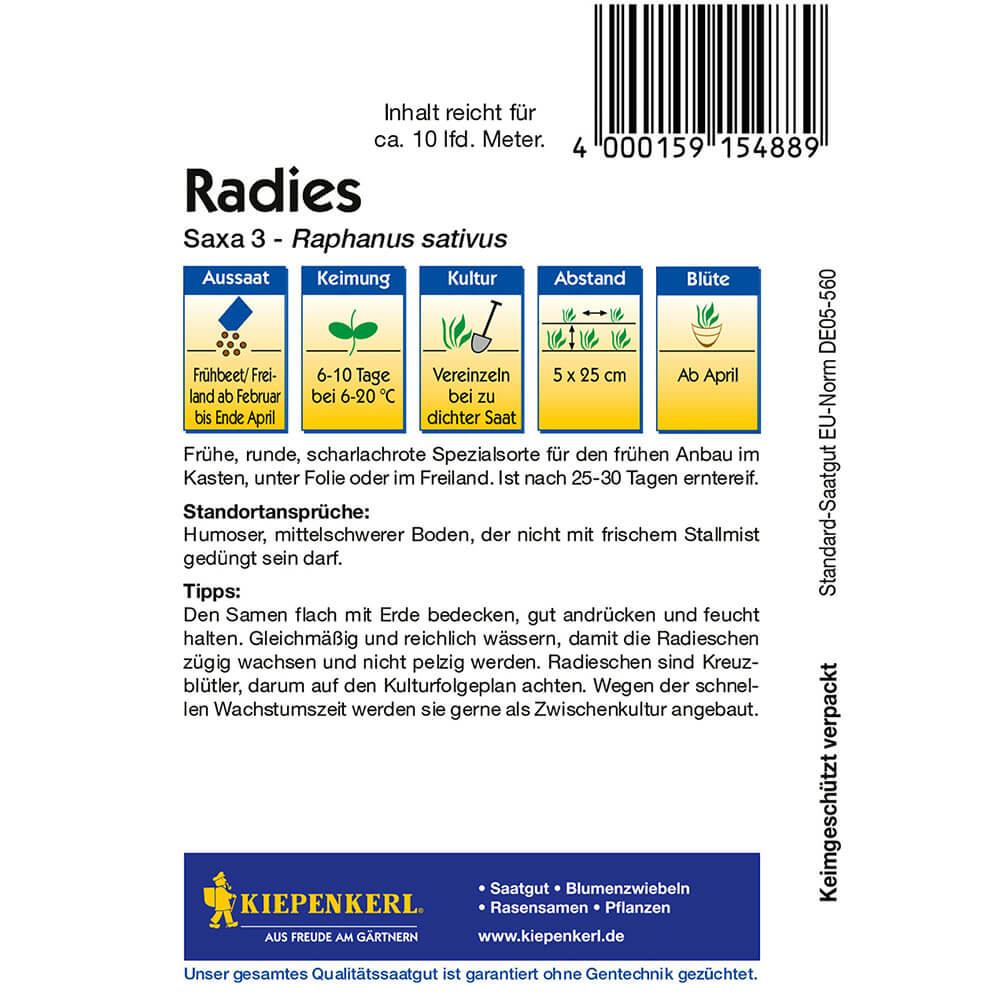 Počet kusů v balení:1 ks Odrůda vhodná pro rychlení a polní pěstování. Je vhodná i pro podzimní sklizně ze srpnových výsevů. Červené kulovité bulvičky. Chuť dužiny je jemná a pikantní. Ředkvičky jsou velmi oblíbenou zeleninou s vysokým obsahem vitamínů. Hodí se k přímé konzumaci, na ozdobu pokrmů nebo do zeleninových salátů.