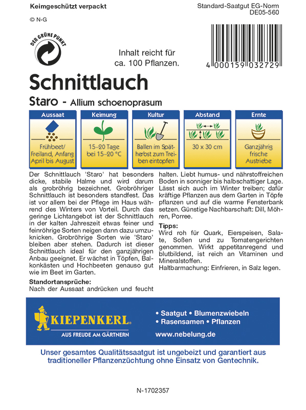 Počet kusů v balení:1 ks Pažitka patří mezi trvalky, má pěkné jedlé květy a hodí se rovněž do okrasných a jedlých trvalkových výsadeb. 'Staro' je vitální, výnosná odrůda pažitky vhodná pro rychlení v nádobách i pěstování na záhoně. Listy jsou tmavě zelené, dlouhé a pevné. Tato odrůda s velmi bujným růstem dobře přezimuje. Srovnávací studie ukazují, že odrůda Staro má výrazně širší / silnější listy než jiné odrůdy. Kromě využití za syrova je velmi vhodná k mražení nebo sušení. Balení osiva vystačí na zhruba 100 rostlin.