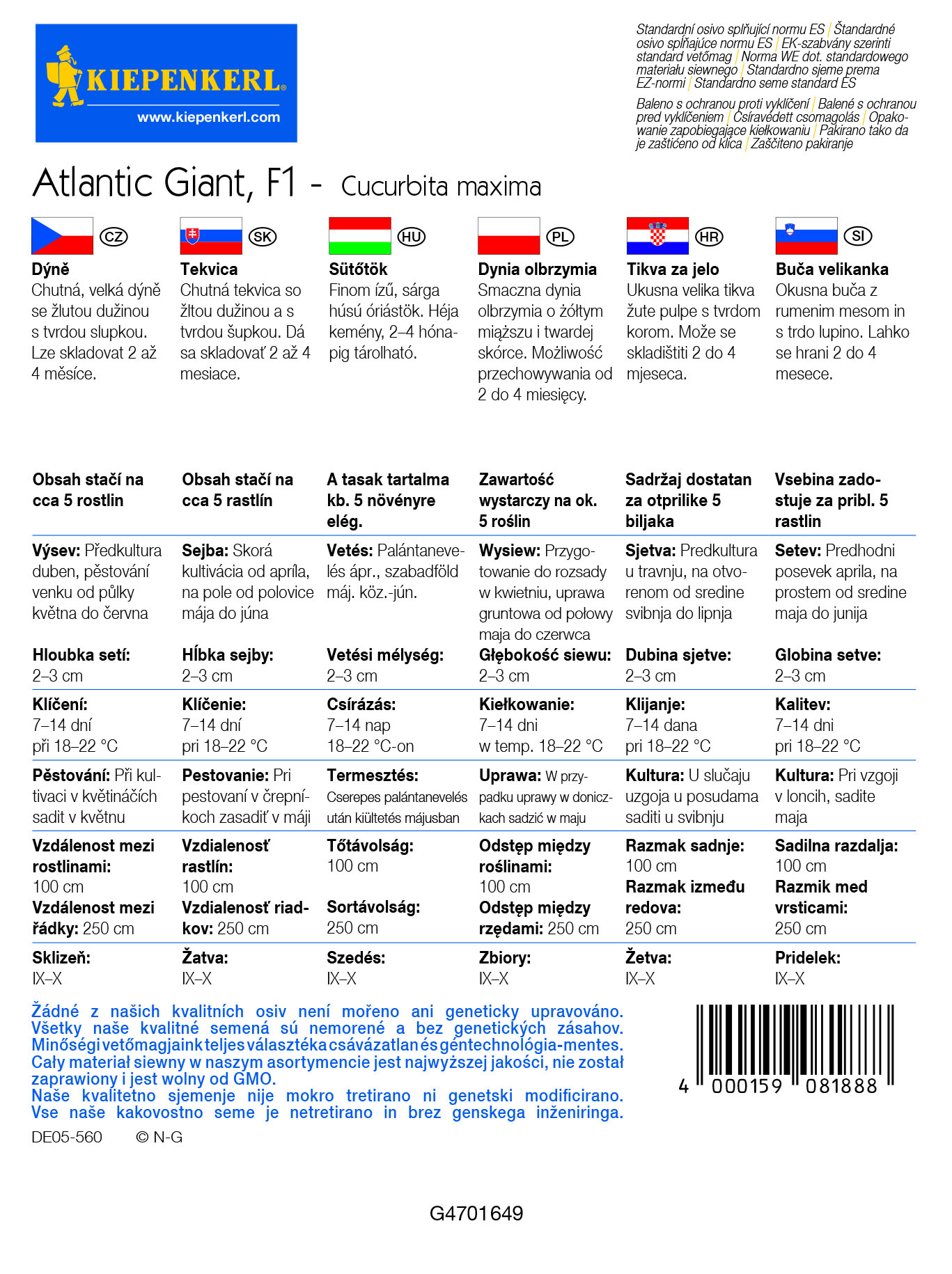 Počet kusů v balení:1 ks Plazivá velkoplodá tykev, mohutný vzrůst. Světle oranžové plody, nasládlá, žlutá dužnina silná 5 až 10 cm, hmotnost plodu je cca 30 kg. Dužina je vhodná na kompot a k tepelné úpravě. Aby dýně dorostly do co největší váhy, doporučujeme ponechat pouze jeden plod a ostatní vyštípat. Balení obsahuje 5 semen.