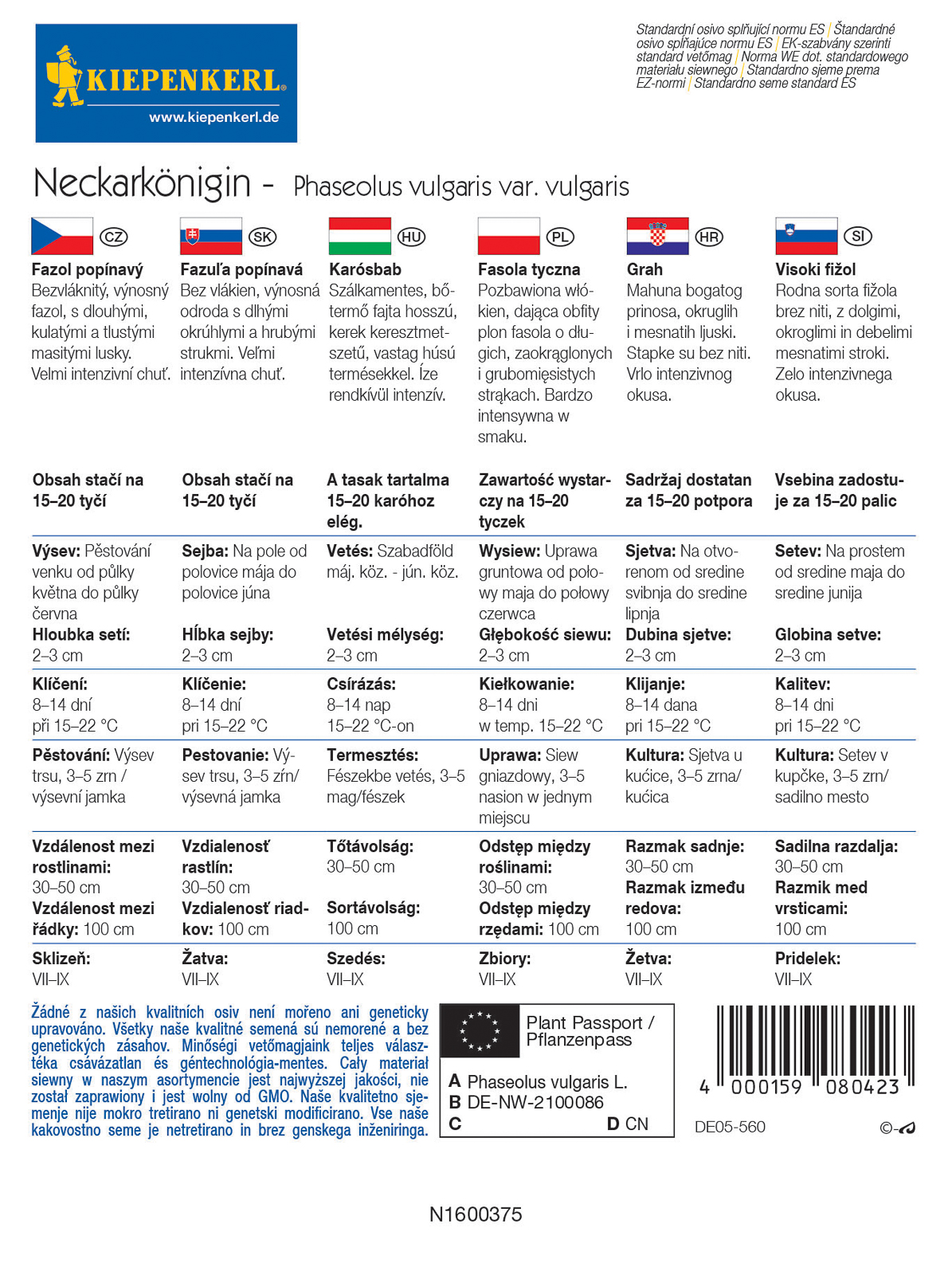 Počet kusů v balení:1 ks Středně pozdní odrůda fazolí s oválným, tmavě zeleným luskem, dlouhým až 28 cm, bezvláknitý. Velký výnos, vhodná také do vyšších poloh. Nutná opora k růstu.