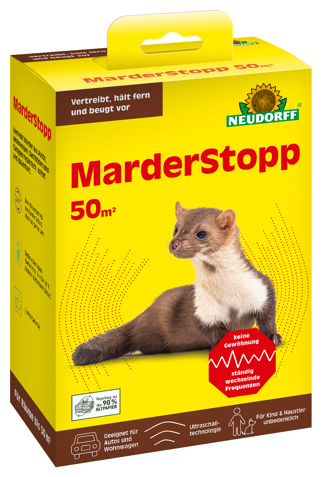 Počet kusů v balení:1 ks Zažeňte a držte kuny trvale pryč s inovativní ultrazvukovou technologií. Plaší kuny z aut, karavanů, půdy nebo garáží hygienicky, okamžitě a trvale. Pro místnosti do 50 m². Provoz na baterie (3x LR14). Zařízení vysílá ultrazvukové vlny, které kuny obtěžují. Tyto ultrazvukové vlny jsou pro lidi a domácí zvířata stěží nebo vůbec postřehnutelné. Pokročilá ultrazvuková technologie vytváří pro kunu nesnesitelné prostředí, proto tuto oblast opouští a vyhýbá se jí. Díky neustálé změně specifických ultrazvukových vln si kuny nemohou na plašič zvyknout. Použití: odšroubujte zadní část zařízení a vložte baterie (3x LR14) do prostoru pro baterie (ujistěte se, že polarita +/– je správná). Umístěte ultrazvukový přístroj do oblasti, kde máte podezření na výskyt kuny. Chcete-li zařízení zapnout, přepněte vypínač ON/OFF do polohy ON. Modrá LED kontrolka na zařízení začne blikat. Pokud modrá LED kontrolka již nebliká, je třeba vyměnit baterie. Životnost baterií je přibližně 5 měsíců v závislosti na kvalitě baterií a okolní teplotě