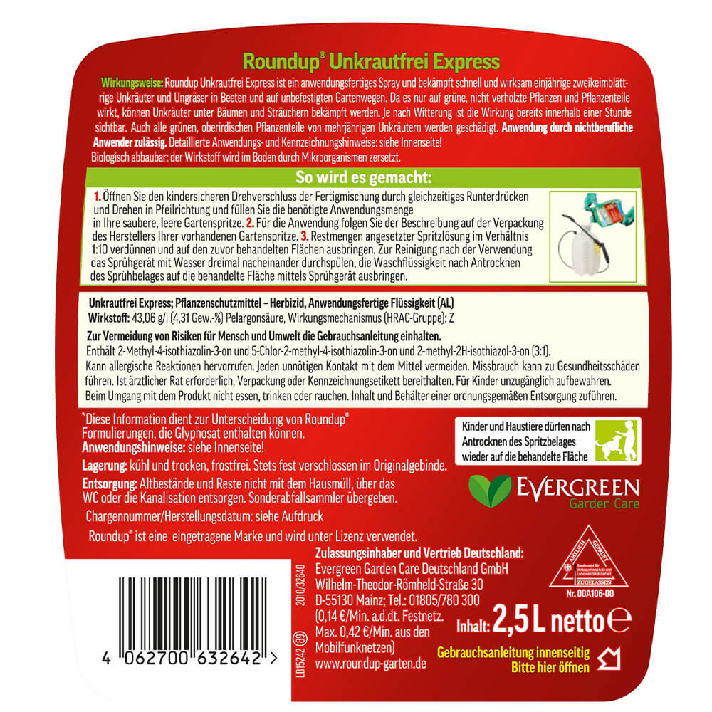 Počet kusů v balení:1 ks ROUNDUP® Express je kontaktní herbicidní přípravek určený k likvidaci nežádoucích širokolistých a trávovitých plevelů. Velmi rychlý vizuální efekt – již 1-3 hodiny po aplikaci - vadnutí plevele. Pro hubení plevelů pod okrasnými keři a stromy za předpokladu, že jsou již hluboko zakořeněné s dřevitou kůrou. Při přípravě a zakládání nových záhonů na výsadbu a výsev okrasných rostlin, ovoce a zeleniny. Kolem skleníků, zimních zahrad a podél plotů. Pro odplevelení před jarním nebo podzimním rytím. Účinná látka na přírodní bázi - kyselina pelargonová (43,06 g/l). Neobsahuje glyfosát. Aplikace: duben – říjen. Přípravek je připravený k okamžitému použití, není třeba ředit. Přelijte ho do nádoby s rozprašovačem nebo postřikovače a aplikujte na porost. Nepoužívejte, pokud existuje riziko úletu na sousední populace rostlin. Dodržujte bezpečnostní předpisy, používejte bezpečností pomůcky a během práce s přípravkem nejezte ani nepijte. Balení 5 litrů.