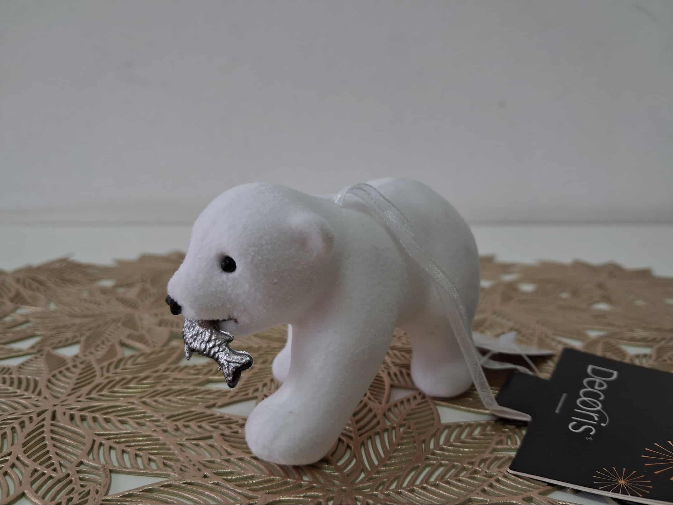 Figurka ledního medvěda s rybou v tlamě je vhodná jako dekorace nebo ozdoba na vánoční strom. Materiál plast potažený semišem. Velikost 10,5 cm.