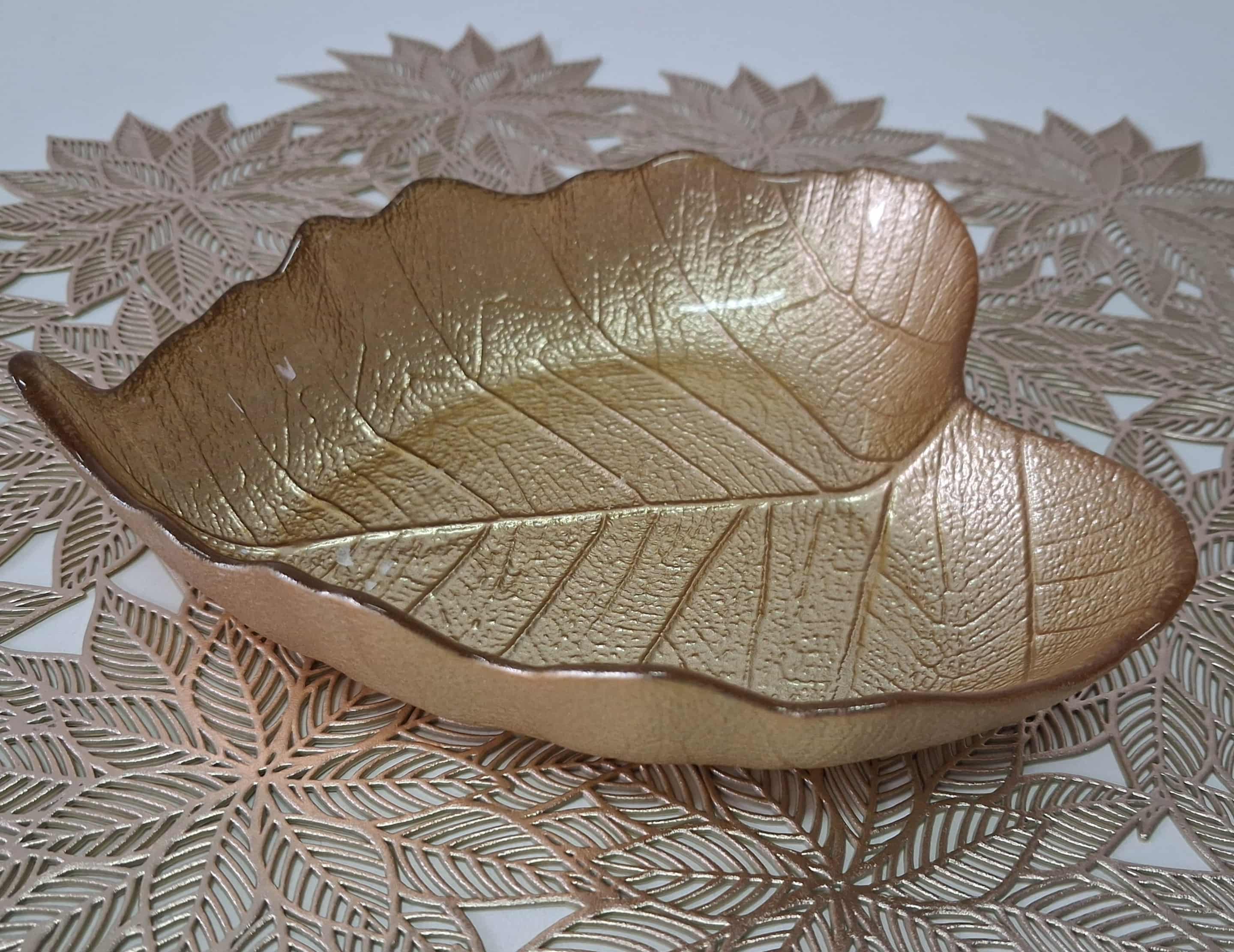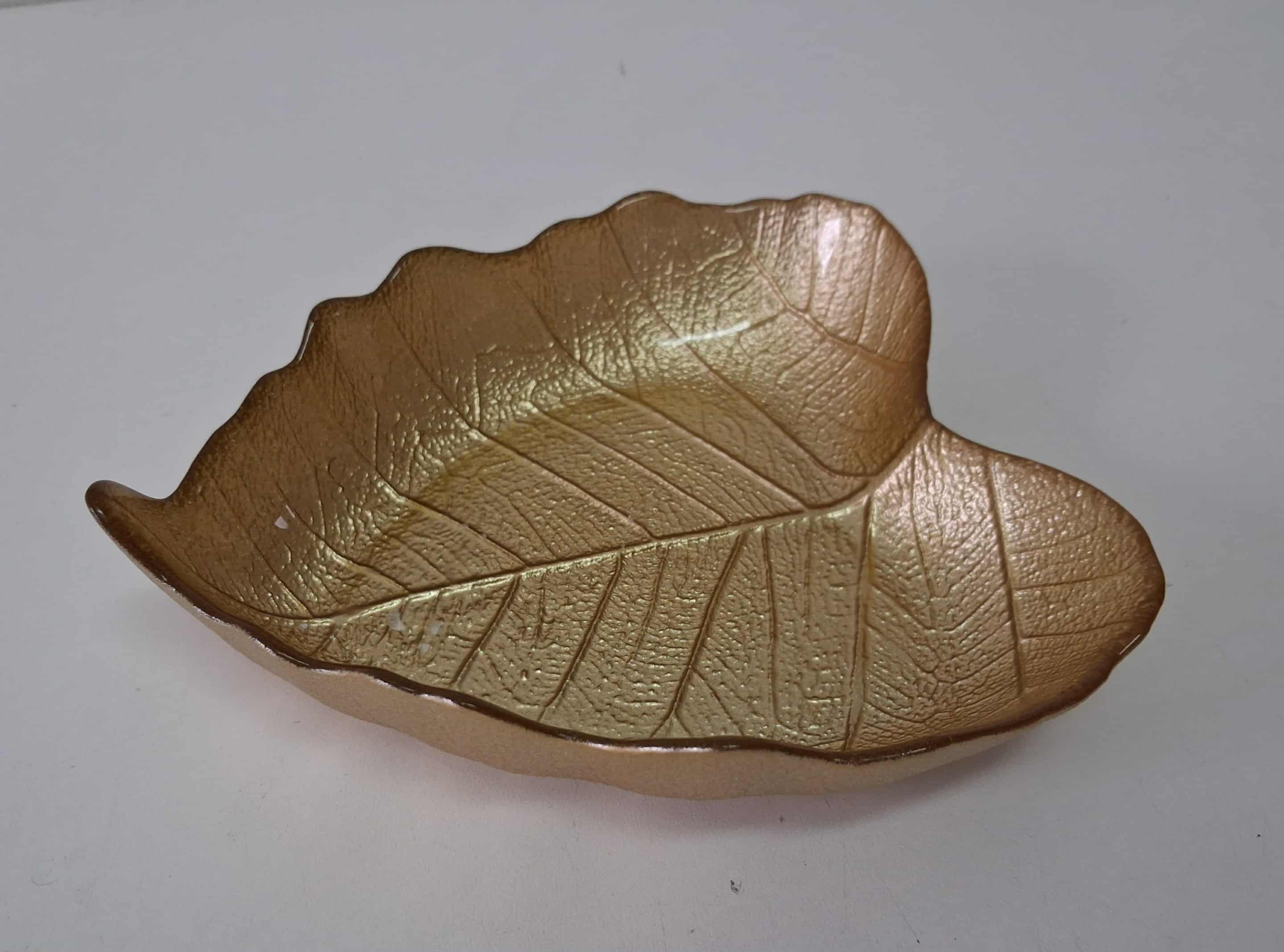 Dekorativní miska ve tvaru listu je vhodná např. pro servírování drobných pochutin, jako dekorativní prvek nebo pro odkládání šperků. Materiál: sklo. Rozměry: cca 16,5 x 15 cm.