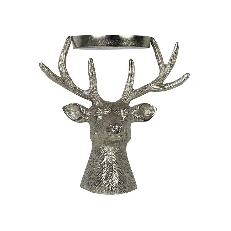 Stříbrný svícen ve tvaru jelení hlavy. Do kruhové misky v horní části parohů lze vložit svíčku do průměru až 8 cm. Výška 17 cm, šířky 16 cm, délka 13 cm. Materiál: kov. Hmotnost: 0,43 kg