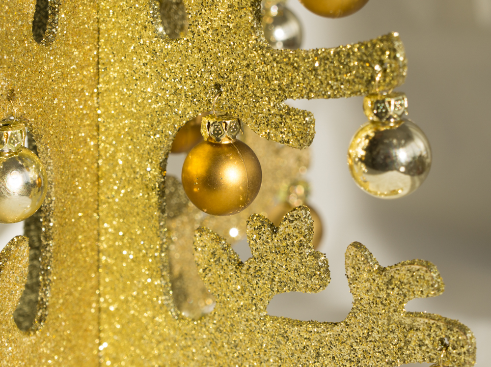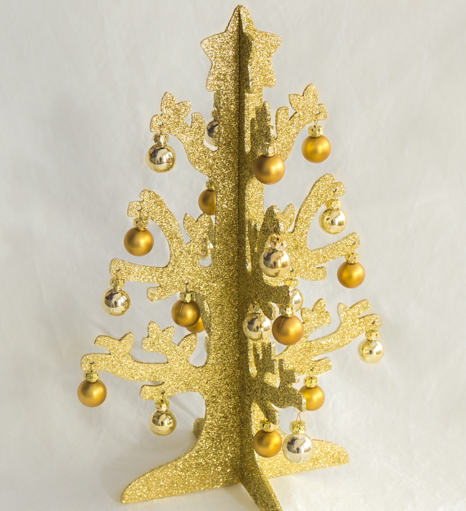 Třpytivý zlatý vánoční stromek s ozdobami. Vysoký 34 cm. Lze ho složit, snadné skladování.